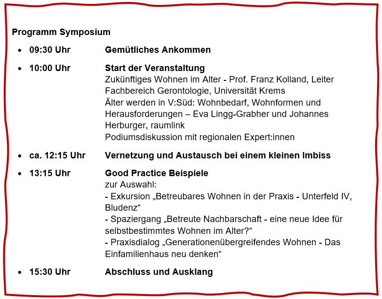 Das Symposium richtet sich an alle, die Wohnen im Alter aus unterschiedlichen Blickwinkeln begleiten, planen oder umsetzen: